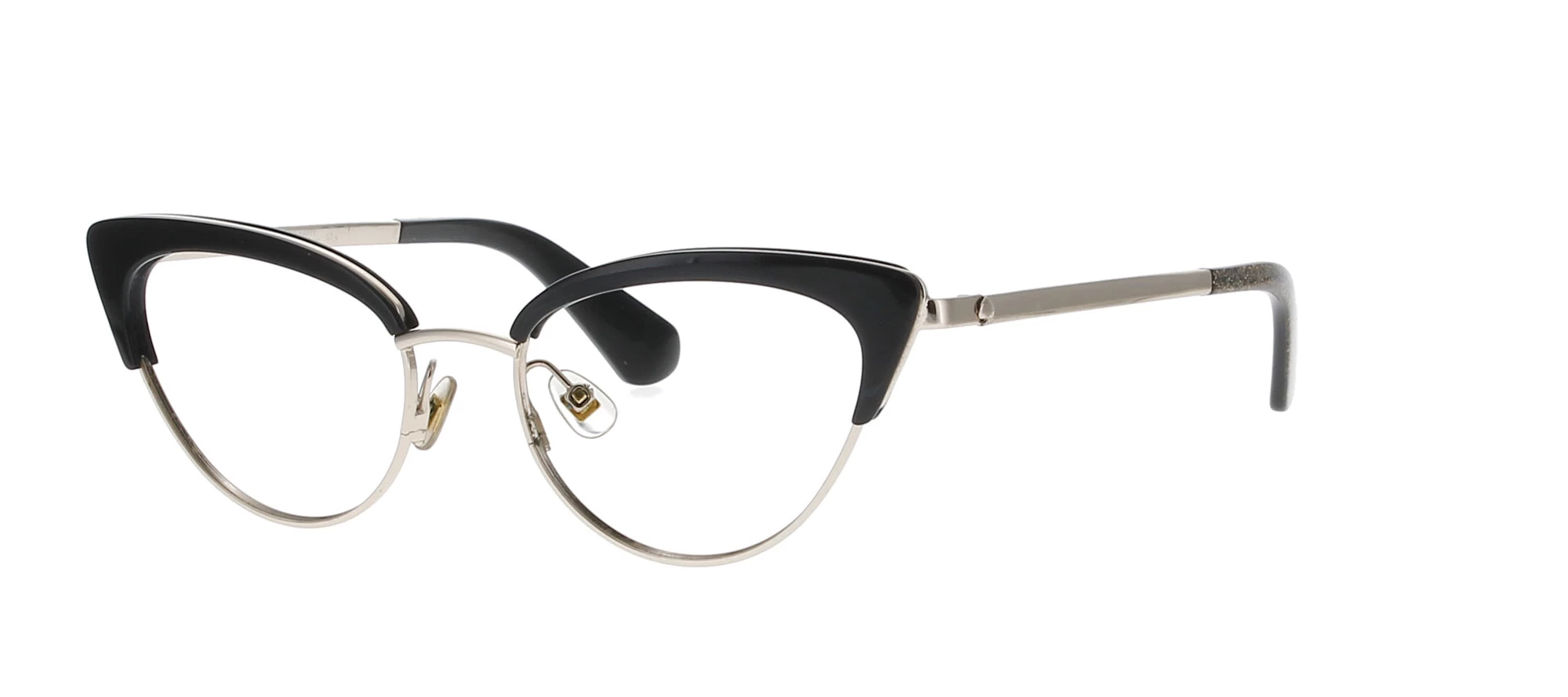 The frame front is a mix of black acetate for the upper part and and gold metal for the lower front. The gold temples carry the brand logo and have shiny metallic tips to half of the arms